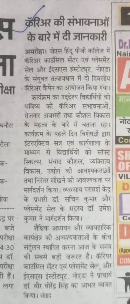 जे.एस. हिन्दू कॉलेज, अमरोहा में करियर काउंसिल सेंटर एवं प्लेसमेंट सेल और ईएसएस इंस्टीट्यूट, नोएडा के संयुक्त तत्वावधान में दो दिवसीय करियर कैम्पेन (23-24 सितंबर, 2025) का सफलतापूर्वक आयोजन किया गया।